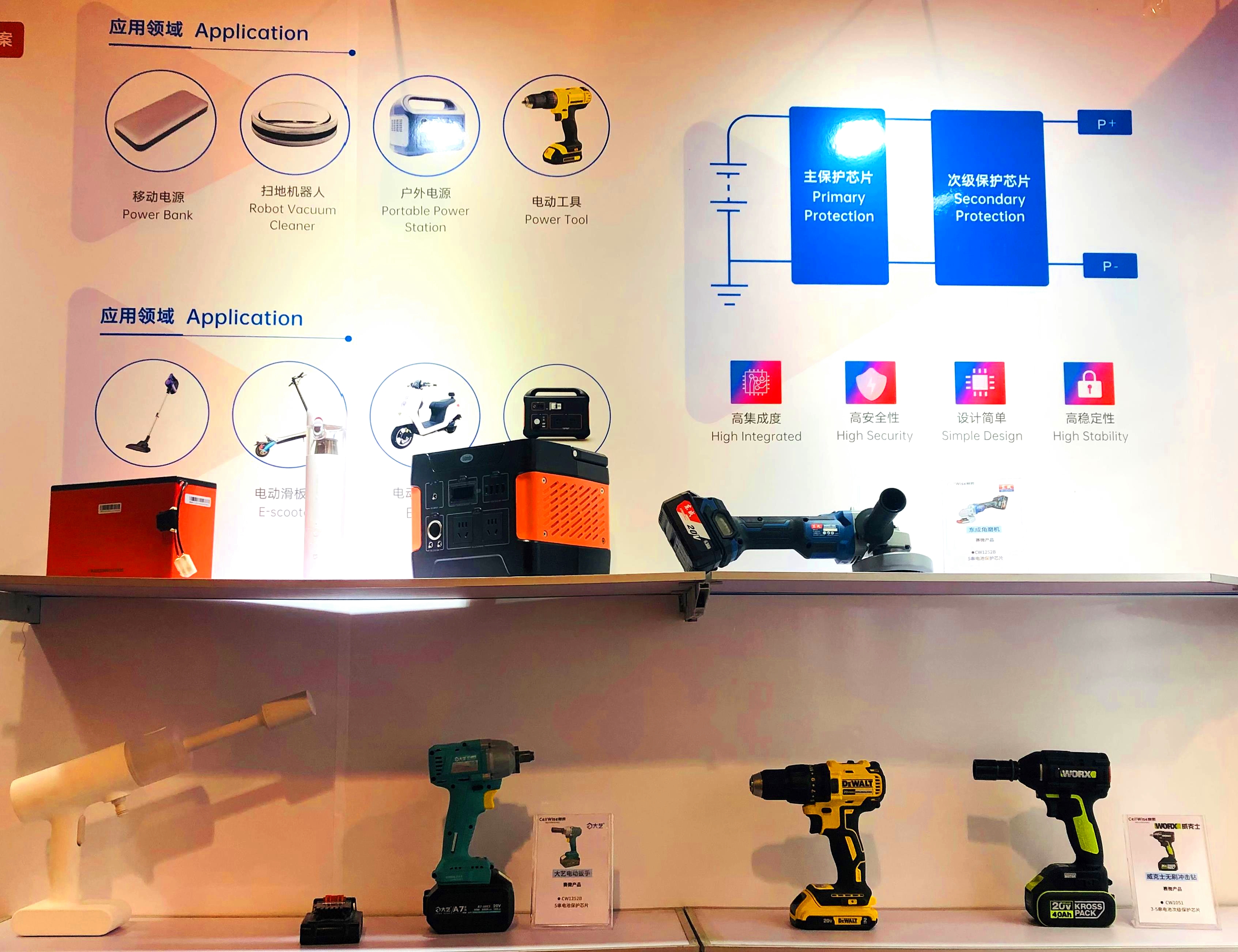 以本次展會(huì)中備受觀眾關(guān)注的電動(dòng)工具解決方案為例,賽微微電為客戶(hù)提供先進(jìn)的電池保護(hù)和電機(jī)控制一站式解決方案,包括全功能鋰電保護(hù)芯片-CW1053、CW1243、CW1233,鋰電池次級(jí)保護(hù)芯片-CW1051,以及電機(jī)控制芯片-CW5053。